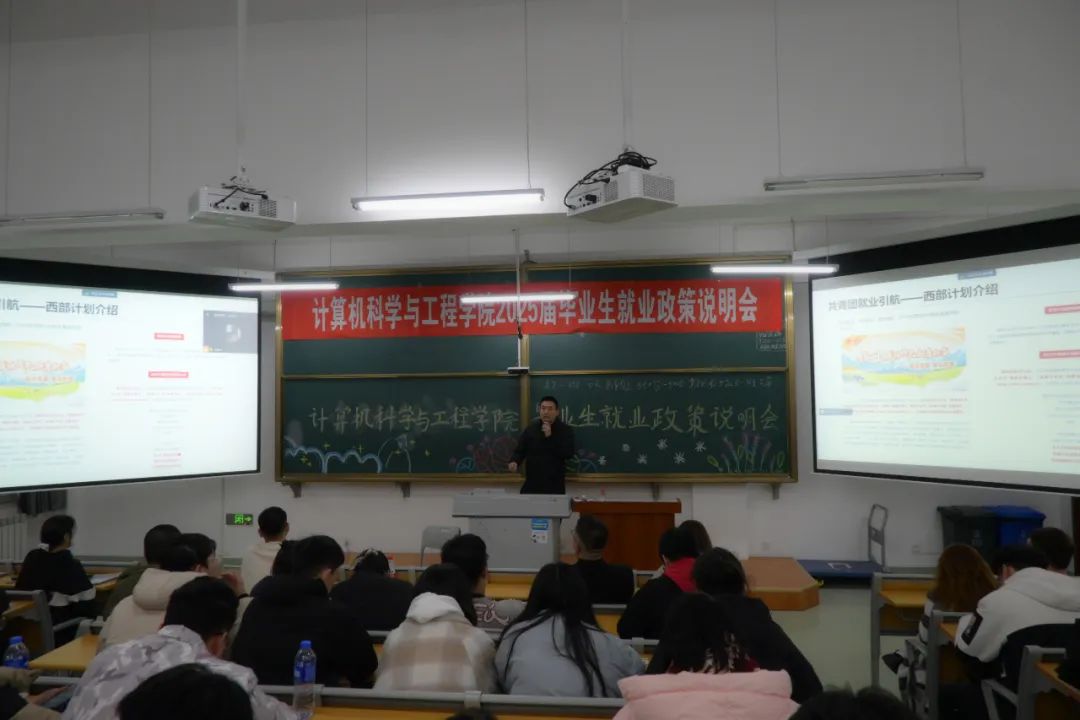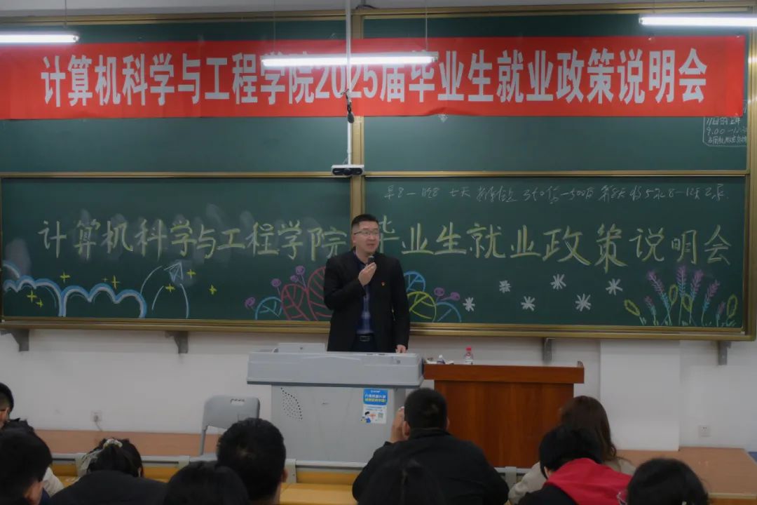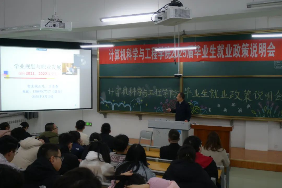 为进一步落实落细学校党委2025届毕业生就业工作推进会的各项决策部署,推动毕业生实现高质量就业,真正帮助2025届毕业生顺利度过就业爬坡期和关键期,引导2026届毕业生提前找准就业方向。2025年3月10日,计算机科学与工程学院举办2025届毕业生就业政策说明会。招生就业处处长王喜春、学院党委副书记赵春辉、毕业生辅导员和全体2025届毕业生、部分2026届毕业生参加会议。