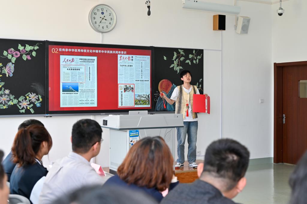 会上,全体团员学习了习近平总书记考察湖南第一师范学院、中国人民大学和清华大学时的重要讲话精神,重温了习近平总书记给中国农业大学科技小院的同学们重要回信内容,对习近平总书记重要文章《加强文化遗产保护传承弘扬中华优秀传统文化》进行了专题学习。团支部成员王子微同学,曾服役于中国人民解放军海军吴运铎舰,结合个人成长及母亲作为同江市鱼皮手工艺品非遗传承人的经历,与同学们分享“在传承中华优秀传统文化中铸牢中华民族共同体意识”微团课。在主题交流环节,团支部成员林师慧、朱晨玮、杨姊炫、艾克兰木·艾合拜尔结合自身学习、实践经历,将专业学习与铸牢中华民族共同体意识主线工作相融合的体会进行交流,号召支部全体成员立志为中华民族伟大复兴而读书,成堪当民族复兴重任之才。班导师李宏岩从信仰、传承、奋斗三个方面深情寄语,希望同学们要坚定理想信念,不断汲取中华优秀传统文化的养分,用个人的奋斗书写新时代的华章,为实现中华民族伟大复兴不懈努力。
