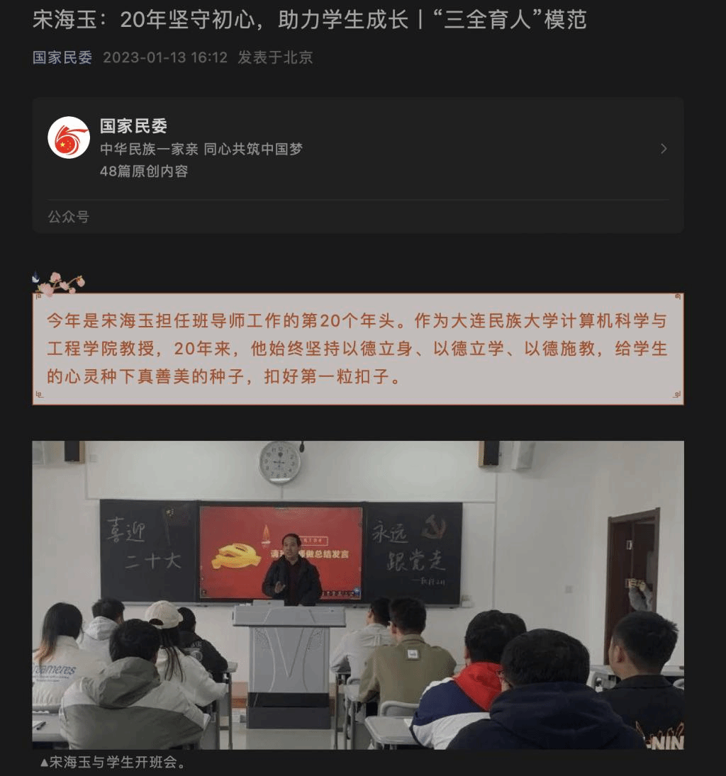 面对这些困难,宋海玉没有退却。在韦怡刚转来班级时,他就早早为她做好学业规划和职业规划;为照顾行动不便的韦怡,班级同学自发组织背着她上下楼,还为她留出专属座位。在师生共同努力下,韦怡成绩不断进步,先后获得国家励志奖学金、大连市“自励自强标兵”,还被共青团中央、全国学联授予“中国大学生自强之星”称号。