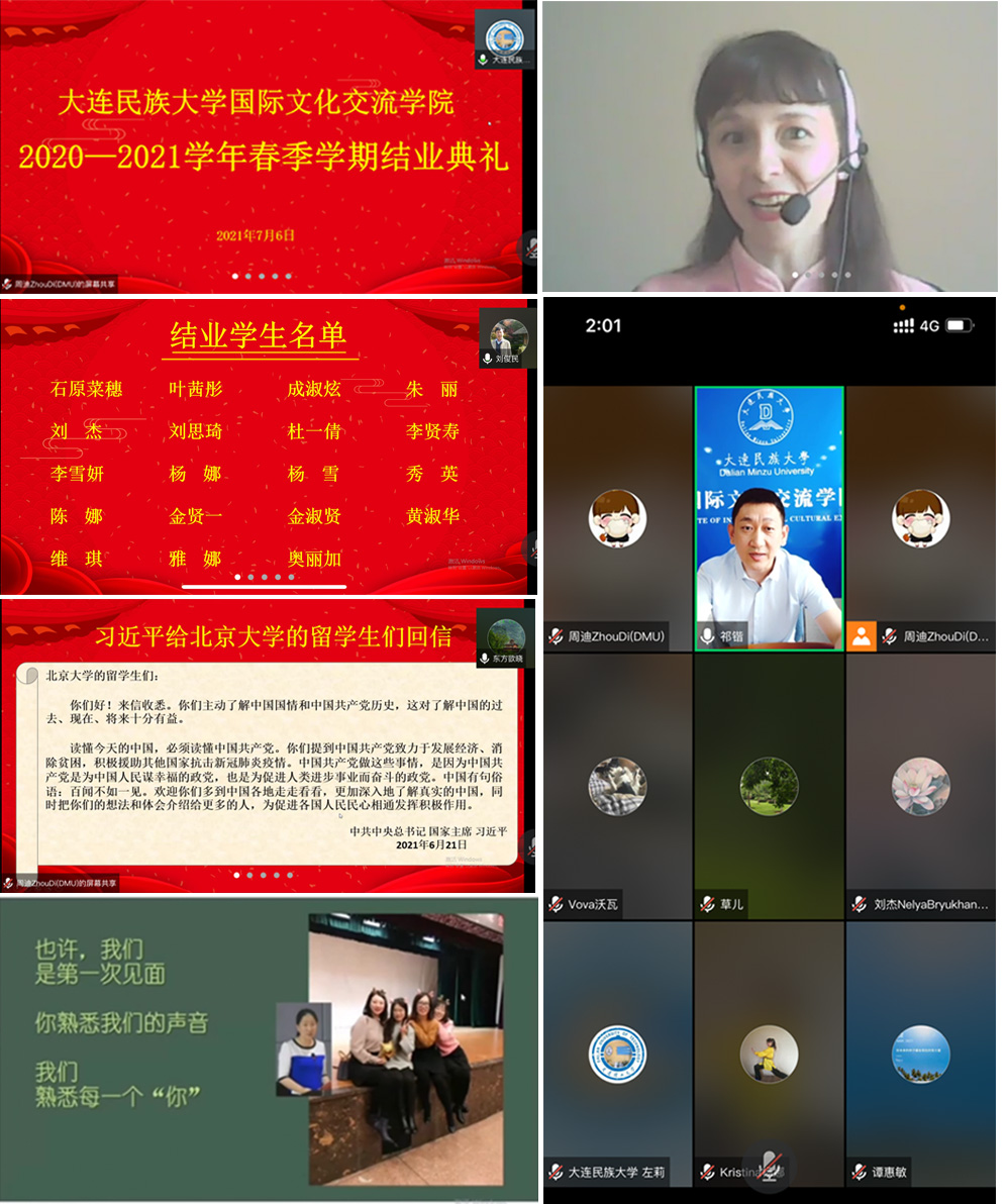 国际文化交流学院副院长刘俊民宣读2020-2021学年春季学期结业留学生名单,祝贺19名留学生顺利结业。来自俄罗斯布里亚特国立大学的交换生杨娜同学作为留学生代表发言,她感谢老师们严谨教学的工作作风和丰富多彩的授课形式,祝福老师们万事顺利、身体健康,在今后的学习生活中会“学而时习之”,为中俄的文化交流、经济合作、国家友好关系贡献自己的力量。于珏慧老师作为任课教师代表,通过一段精心制作的视频,与同学们共同回顾了课堂上的精彩瞬间,并向同学们献上衷心的祝福,鼓励同学们继续探索汉语的魅力,期待与同学们能够继续相聚在民大的课堂。
