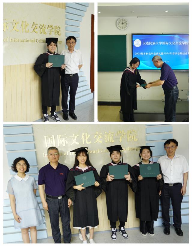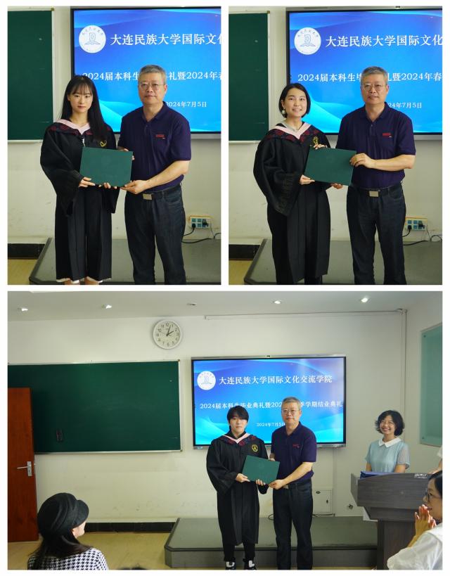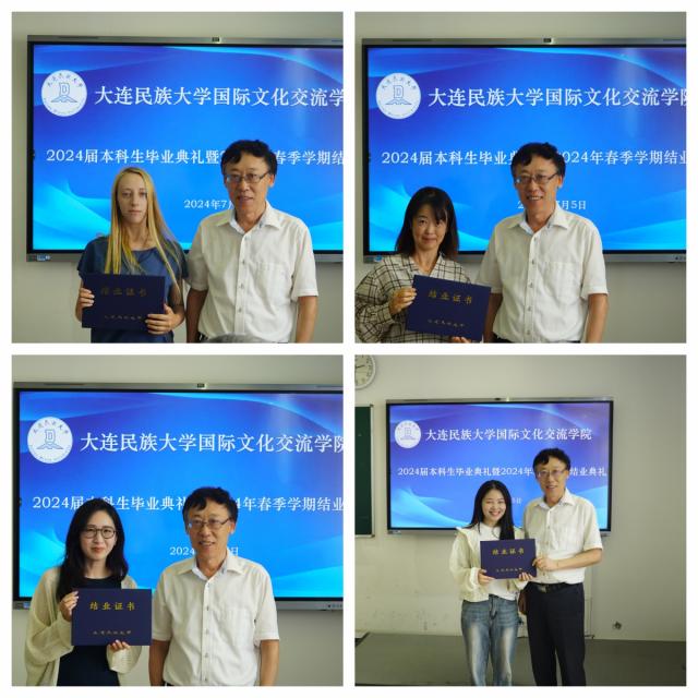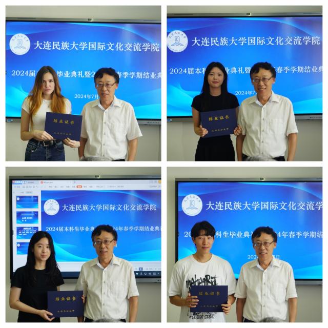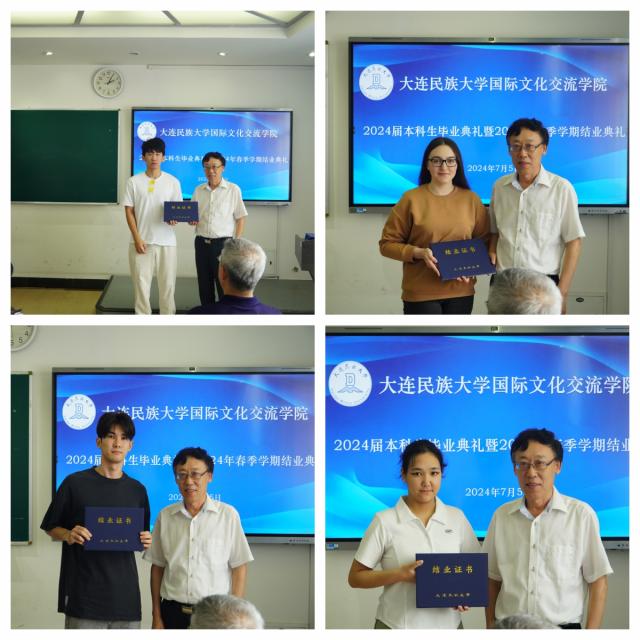 国际文化交流学院直属党支部书记辛会芳宣读了2024届本科拟毕业学生留名单和2024年春季学期结业留学生名单,张志刚院长、刘俊民副院长逐一为同学们颁发证书。