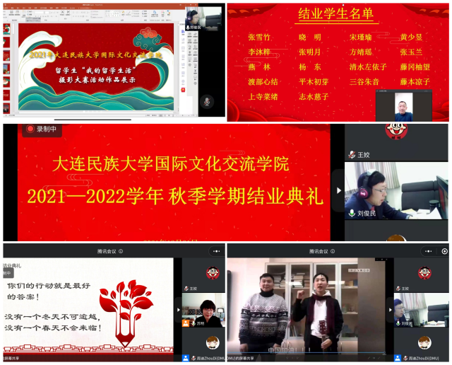 2021年12月31日,国际文化交流学院举办2021-2022学年秋季学期线上结业典礼。来自7个国家的留学生们与学院领导老师们参加了本次典礼。典礼由国际文化交流学院副院长刘俊民主持。