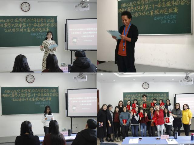 为丰富留学生校园文化生活,提升中文诵读能力和汉语应用能力,选拔优秀的留学生代表欧冠参加大连市第二十一届高校外国留学生汉语演讲比赛,2019年11月27日,国际文化交流学院举办留学生汉语朗诵比赛暨大连市第二十一届高校外国留学生汉语演讲比赛校内选拔赛。国际文化交流学院副院长刘俊民、系主任谭惠敏、教师代表担任本次比赛的评委。