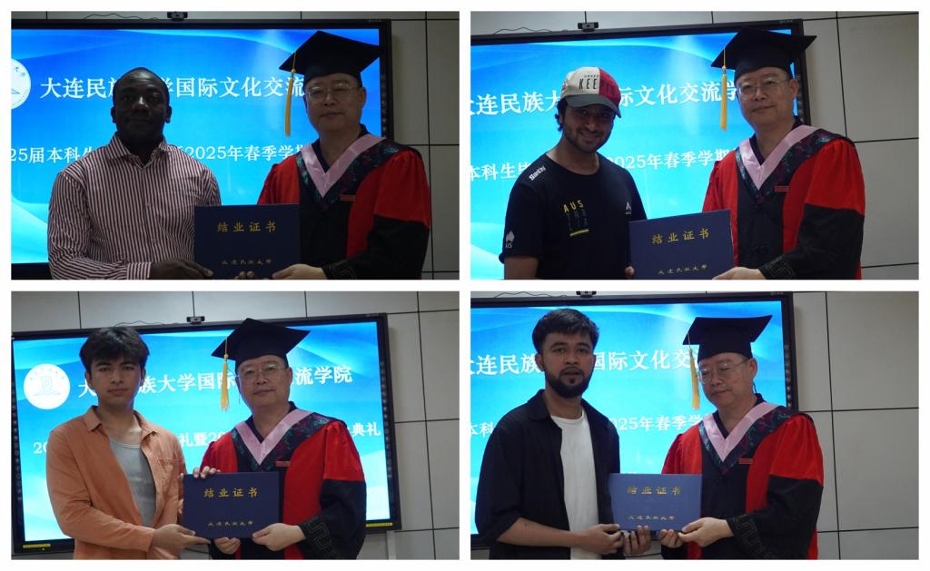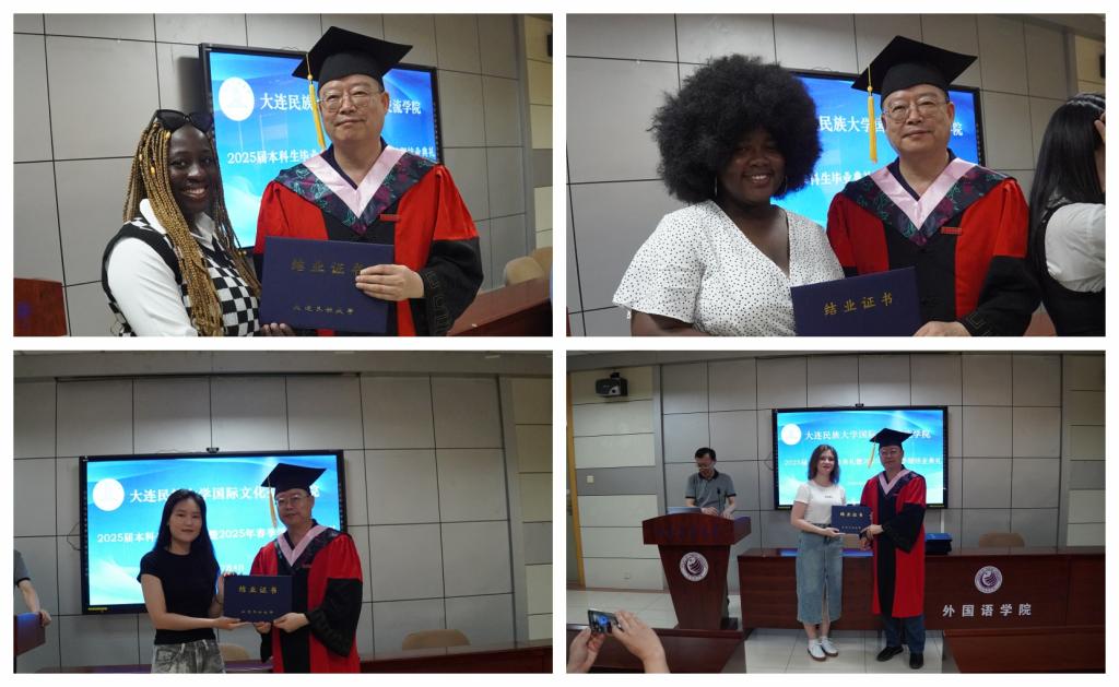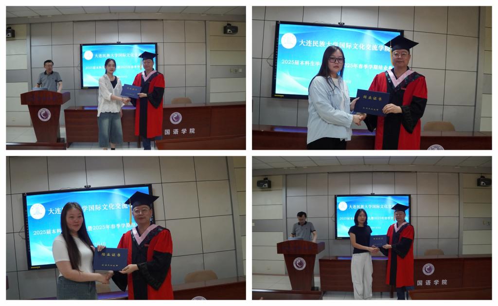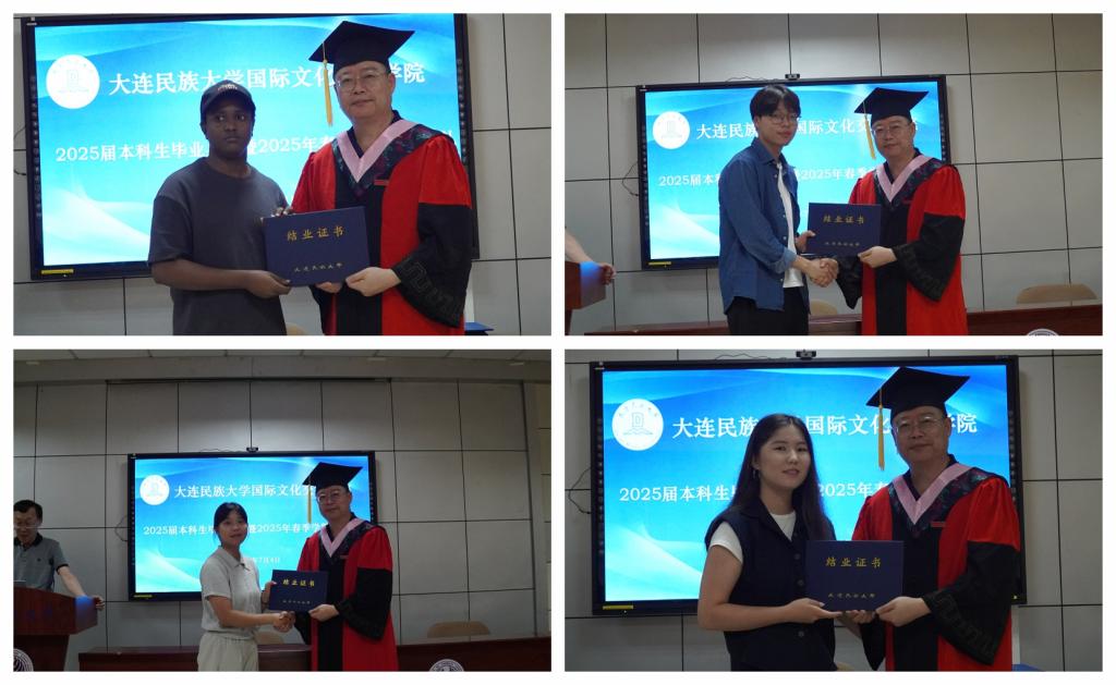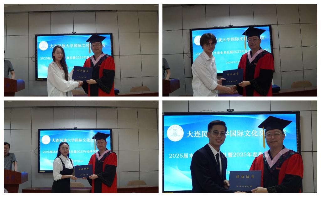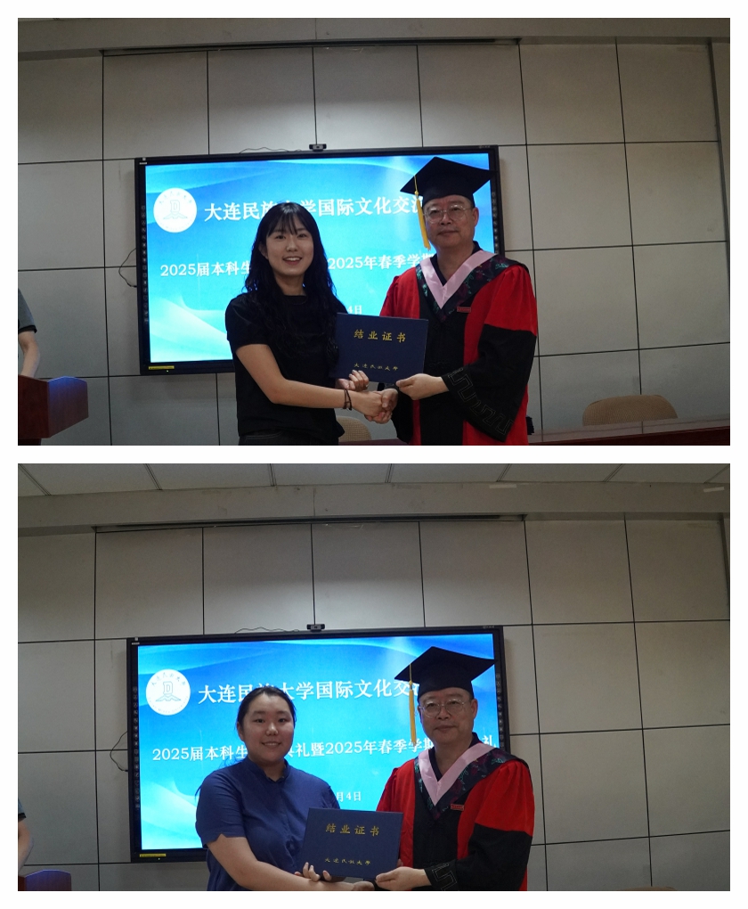 典礼上,国际文化交流学院院长张志刚郑重宣读了2025届本科拟毕业学生名单和2025年春季学期结业留学生名单。随后,张志刚院长与刘俊民副院长依次为每一位同学颁发证书,将这份凝聚着辛勤与努力的成果郑重交到他们手中。