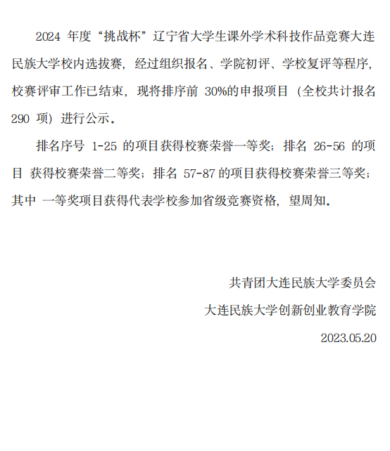 2024 年“挑战杯”辽宁省大学生创业计划竞赛 欧冠官方网站校内选拔赛成绩及晋级名单公示