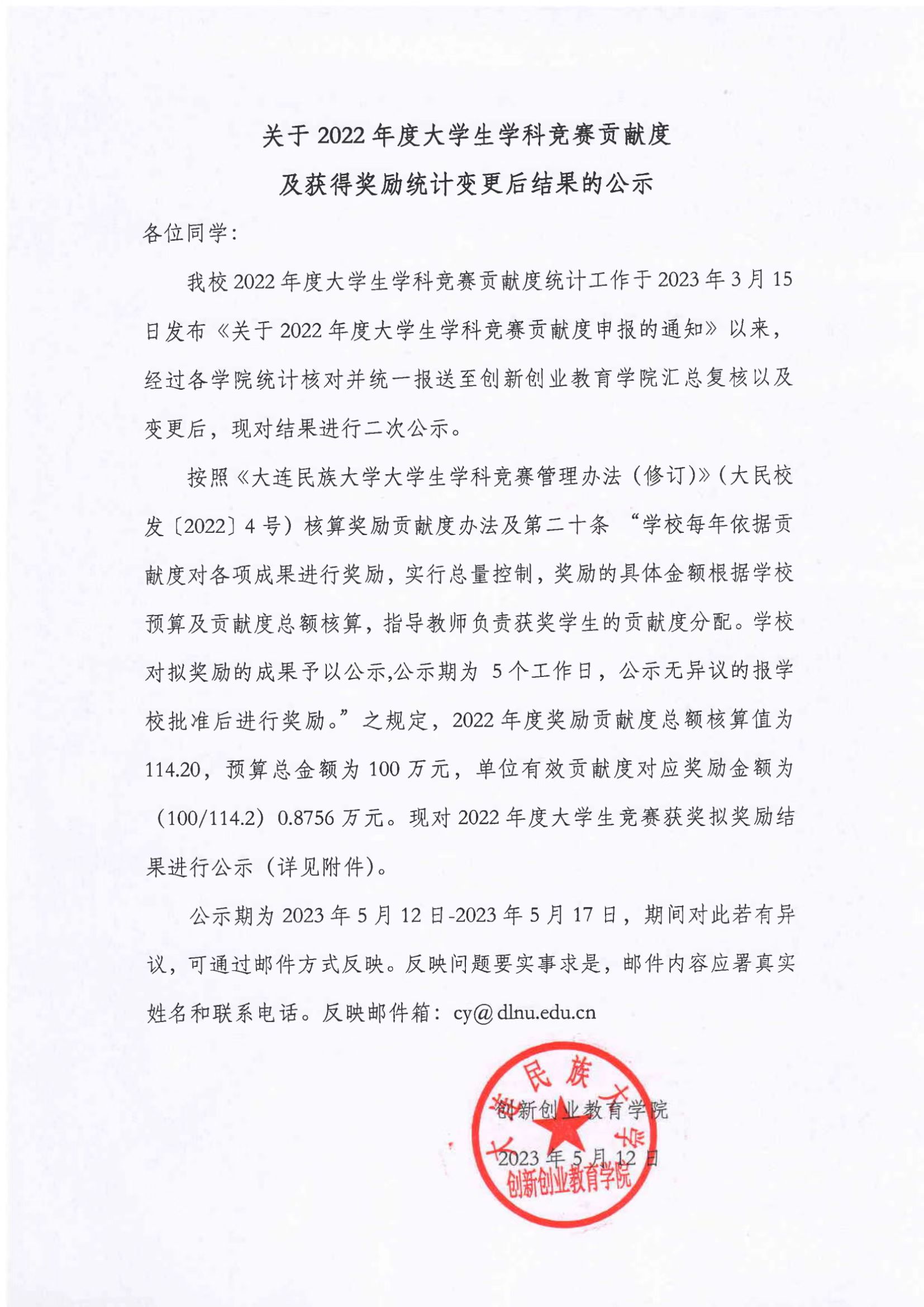 关于2022年度大学生学科竞赛贡献度及获得奖励统计变更后结果的公示