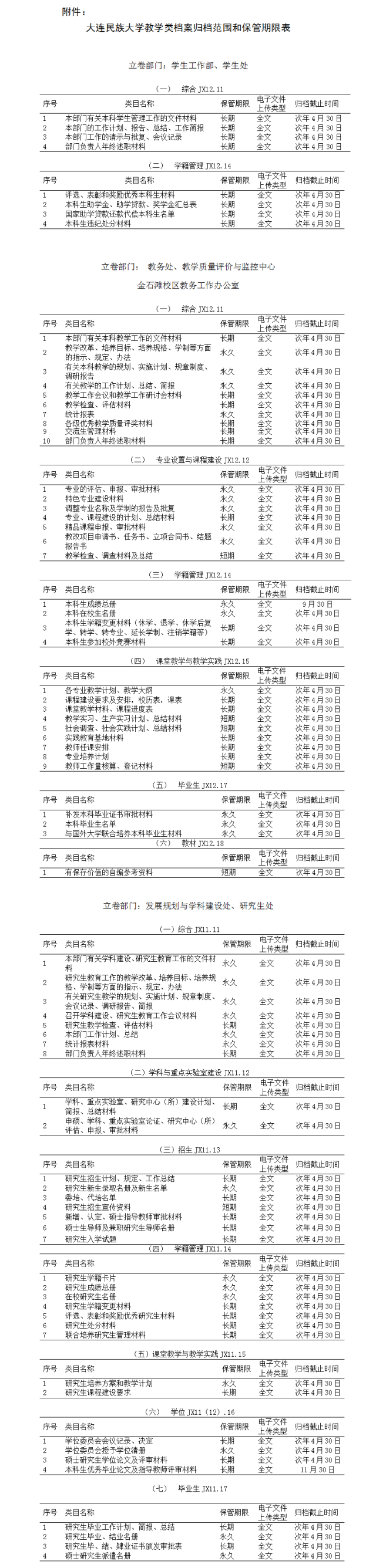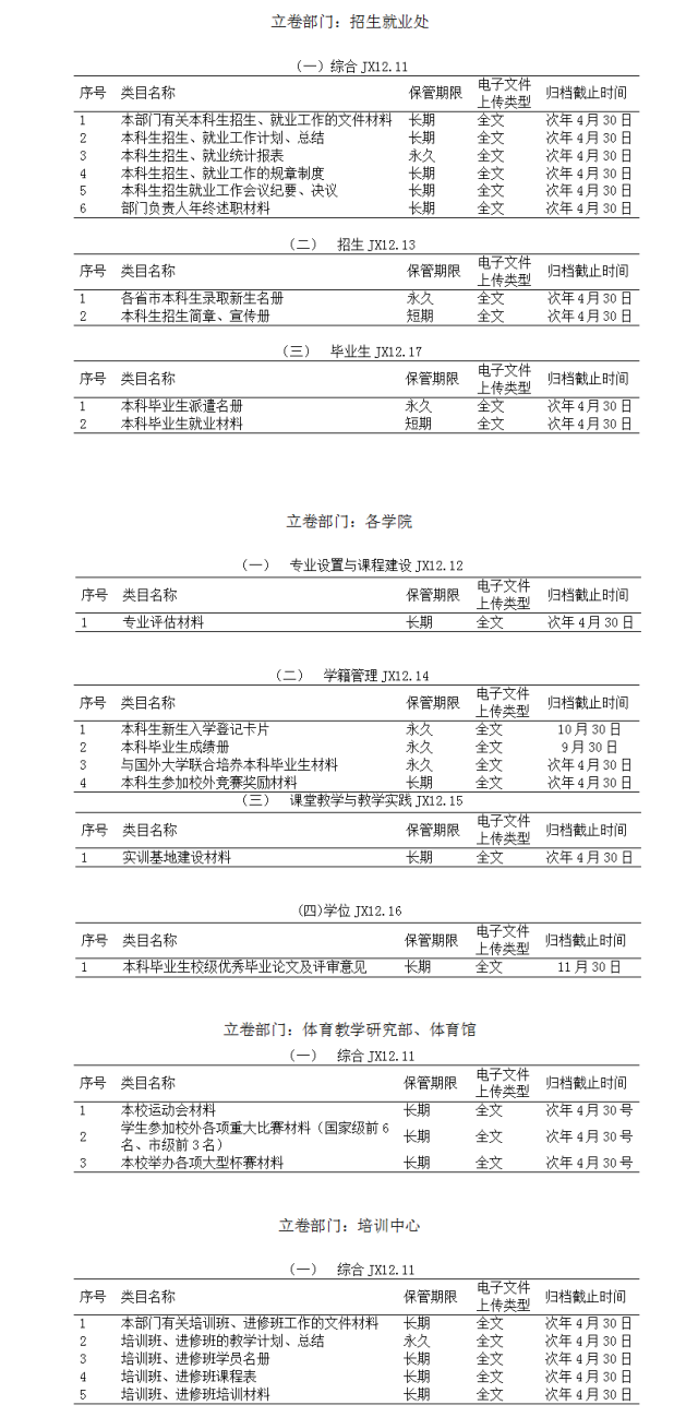 2、归档的主要内容包括综合管理、学科与实验室建设、招生、学籍管理、课堂教学与实践、学位工作、毕业生工作、教材,特别是学校在教学实践各个环节活动中形成的不同载体的文件材料等方面,具体范围见附件。(纸质和电子文件材料一同归档)