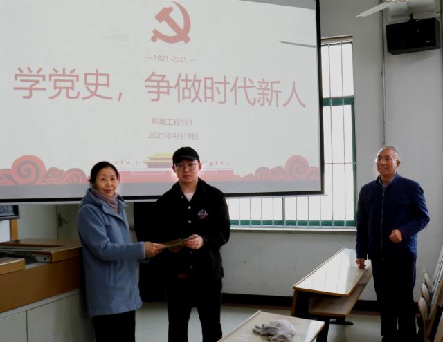 4月19日,校办档案馆党支部参加环资学院校园先锋工程环境工程191班“学党史争做时代新人”主题班会,校办档案馆党支部副书记宋江岩馆长、信息化科王春霞科长、环资学院党总支李华戎书记、团委书记汪发余一道参加了班会。