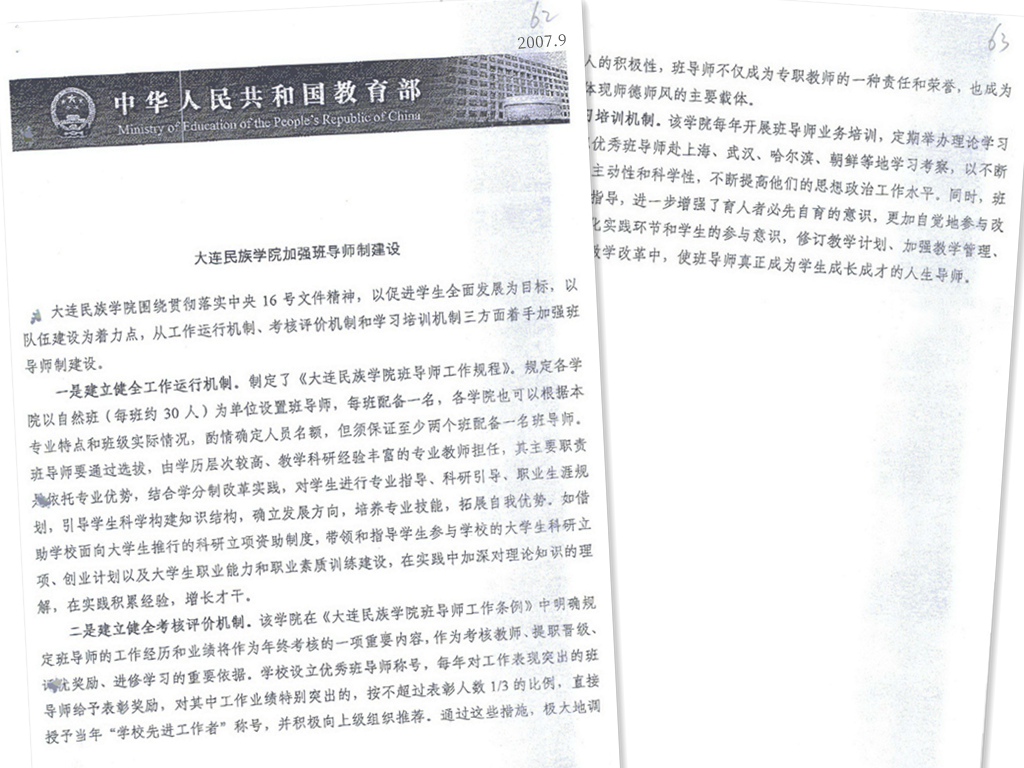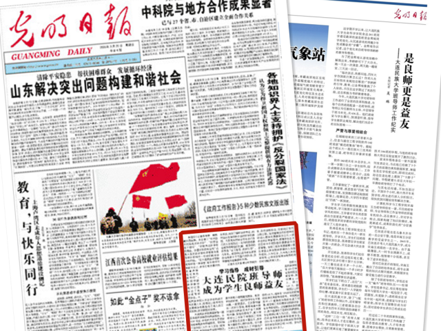 当时经济管理系班导师孙丽坤教授作为接受采访的班导师代表侃侃而谈自己的心得体会,她将心理学的需要层次论引入到学生的日常管理中,根据学生在大学四年中不同阶段的需要进行分层管理。她还道出了班导师共同感受,“在大连民族学院做班导师是一种荣誉,每年教师节表彰大会上,学生总是把最热烈的掌声献给优秀的班导师”。详实生动的采访让宋言荣非常兴奋,他当即表示,作为国家科研教育的主流媒体,就是要把这样的好做法推广介绍给教育工作者。2005年3月20日,《光明日报》在头版以《大连民院班导师成为学生良师益友》为题对欧冠班导师工作深入报道,这篇重要的报道对欧冠班导师工作给予了充分肯定和积极的推广宣传,也是欧冠外宣工作的重要成果。