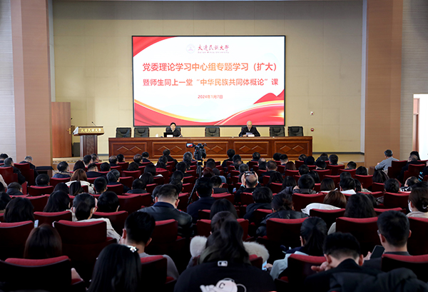 民大新闻网讯 1月7日下午,学校举行党委理论学习中心组专题学习会(扩大)暨师生同上一堂“中华民族共同体概论”课专题报告会,深入学习贯彻习近平总书记在中央政治局第九次集体学习时的重要讲话精神,进一步学习领会习近平总书记关于加强和改进民族工作的重要思想,特别是关于铸牢中华民族共同体意识系列重要论述,指导推进学校工作。党委书记赵铸主持并讲话。
