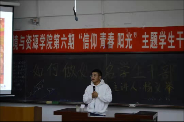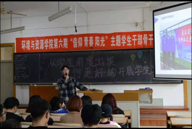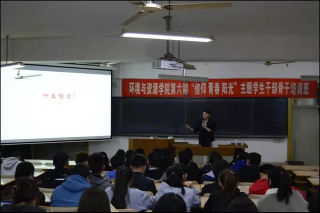 学生干部是学生群体的骨干,是学院学生工作的最前端。为进一步加强学生干部队伍建设,提高学院学生干部的综合素质和工作能力。经过为期一个月的学生干部培训,环境与资源学院第6期“信仰·青春·阳光”主题学生骨干培训班已经圆满结束。此次培训班旨在提升学生干部政治理论素养和工作业务能力,增强团队凝聚力。