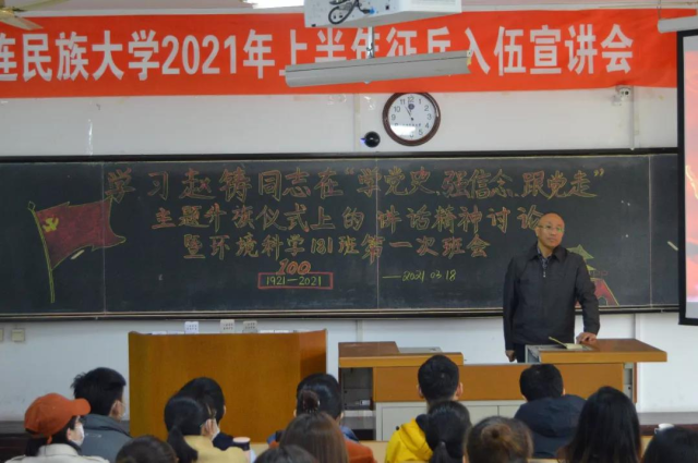 环境科学181班在2-201召开学习学校党委书记赵铸同志在“学党史、强信念、跟党走”主题升旗仪式上的讲话精神讨论暨环境科学181班第一次班会。班会由班长王靖涵主持召开。班会邀请了环境与资源学院党总支书记兼班级辅导员李华戎老师及班导师宋彦涛老师。首先,全体起立合唱国歌;班长王靖涵介绍班会主要内容并播放短视频引入班会;团支书张倩分享赵铸书记讲话以及个人观点;刘馨泽、李晓婷、杨若祎等6位同学(囊括积极分子、发展对象、班委等)借此班会分享个人党史学习心得以及高效学习方法和对学校疫情防控工作的看法;之后班导宋彦涛老师点评此次班会并给予同学新学期新希望;最后书记李华戎老师对班会内容进行了总结,并就党史学习与同学们进行分享,给予同学们信心与期望。