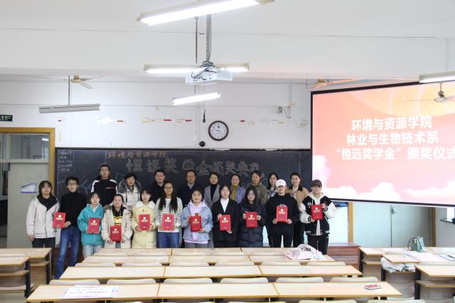 为进一步深入贯彻落实学校学风建设工作会议精神,更好促进生物技术和经济林的专业建设,12月7日,环境与资源学院举办了第二届林业与生物技术系“恒远奖学金”颁奖仪式,学校招生就业处处长王喜春,院长阮成江,副院长金华,党委副书记刘泽,系全体教师以及部分在校学生参加了颁奖仪式。