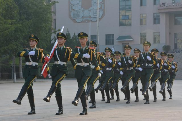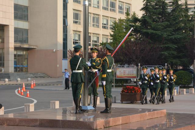 7点整。校国旗护卫队准时列队于国旗旗杆两侧,等待国歌奏响,举行庄严神圣的升旗仪式。
