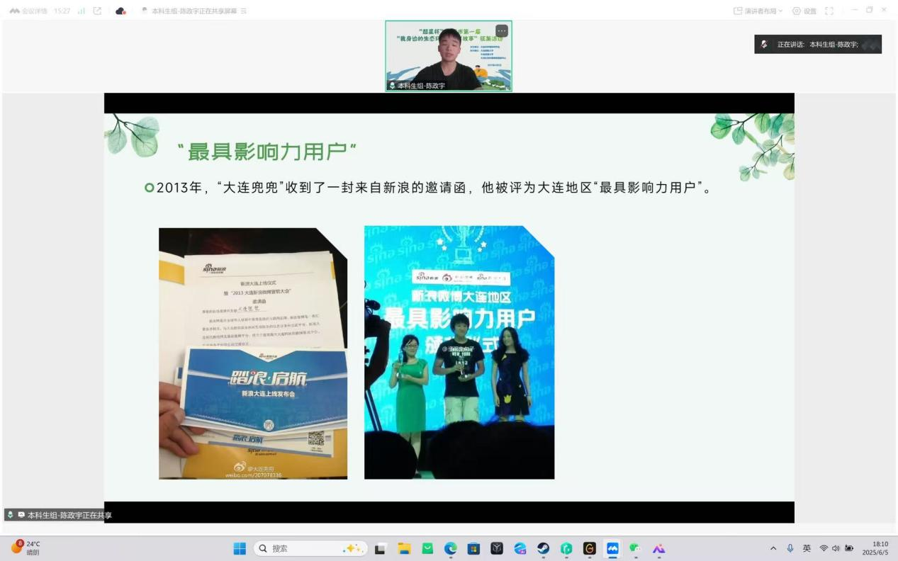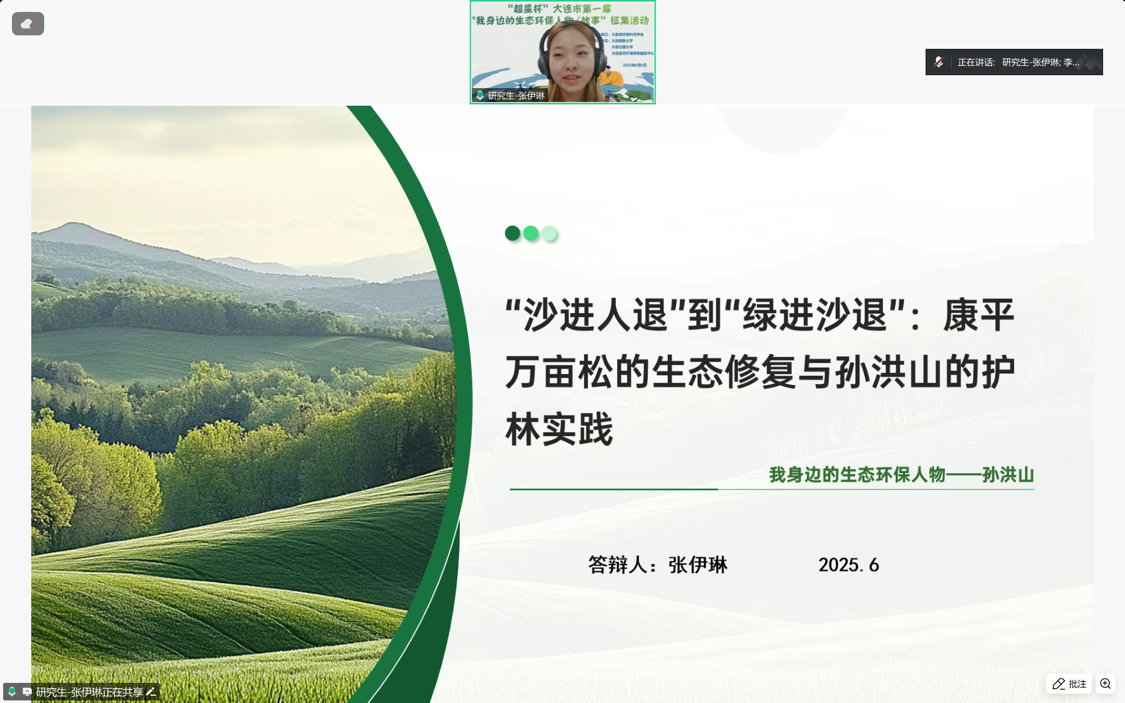 该活动设立本科生组与研究生组两个组别,共征集到参赛作品89项。经专家评委依据事迹感染力与讲述感悟深度等核心标准严格评审,最终评出本科生组一等奖10人,二等奖17人,三等奖21人;研究生组一等奖6人,二等奖10人,三等奖13人。6月5日一等奖优秀作品进行了线上展演,评选出特等奖6项。参赛选手们思路清晰、表达流畅,充分展现了扎实的环境专业素养与投身环保事业的坚定决心。