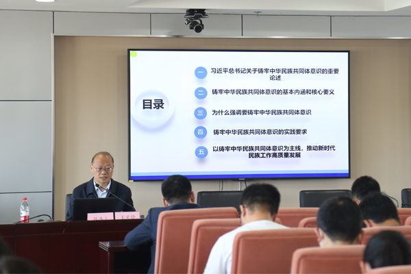 王宏晓围绕习近平总书记关于铸牢中华民族共同体意识的重要论述精神、铸牢中华民族共同体意识的基本内涵和核心要义、铸牢中华民族共同体意识的重大意义、铸牢中华民族共同体意识的实践要求,以及以铸牢中华民族共同体意识为主线、推动新时代民族工作高质量发展等五个方面,做了深入浅出的系统阐述。他指出,铸牢中华民族共同体意识是我们深刻把握所处的历史方位、实现中华民族伟大复兴的题中应有之义,是统筹发展和安全两件大事、维护国家统一实现长治久安的必然要求。他强调,要深入学习习近平总书记关于民族工作的重要论述,全面准确理解铸牢中华民族共同体意识的基本内涵和核心要义,正确认识和处理“一”和“多”的关系、“同”和“异”的关系、“恒”和“变”的关系,增强“五个认同”和国家意识、公民意识、法治意识;要在民族工作中始终牢牢把握这一主线、鲜明地突出这一主线,与时俱进地推动民族工作高质量发展,为实现中华民族伟大复兴的中国梦做出贡献。