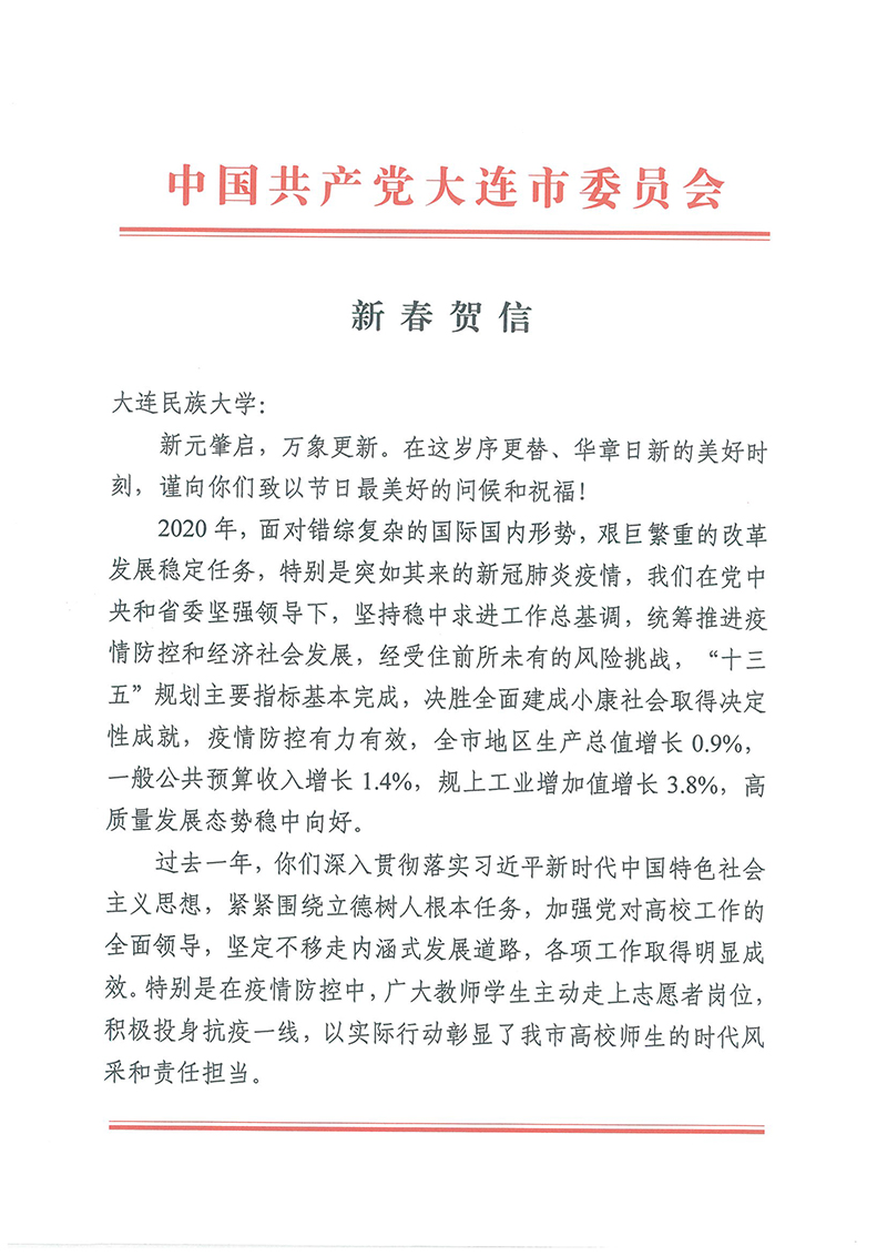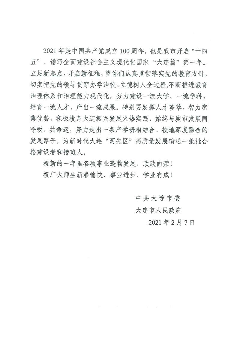 中共大连市委、大连市人民政府致欧冠官方网站新春贺信