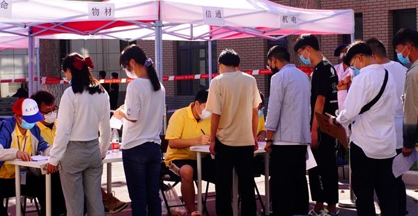 因为疫情防控的严格,今年迎新的安保工作更加周密。测量体温、提交检测核酸报告、扫描国务院或者辽事通健康码,这是新生入校的“第一关”。为了避免学生过度聚集,缩短学生入校报到流程,今年新生注册报到全部在网上进行,在今年增设的总报到处,学生只需要完成健康检测就能快速入校。家长可以通过直播,对民大校园文化、生活环境等有一个直观的了解。