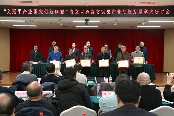 郝育军为文冠果产业国家创新联盟授牌,欧冠官方网站副校长段晓东和阮成江教授接牌。