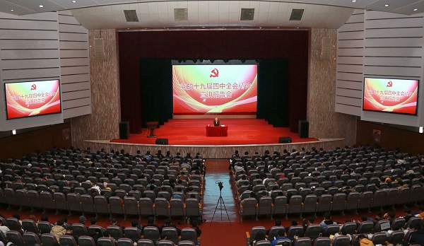 民大新闻网讯 为深入学习宣传和贯彻党的十九届四中全会精神,把广大师生的思想和行动统一到中央重大决策部署上来,按照学校党委统一安排部署,校领导深入联系单位开展宣讲,实现全校师生员工全覆盖。11月25日至26日,党委书记赵铸分别在两校区为经济管理学院、物理与材料工程学院、信息与通信工程学院师生做了党的十九届四中全会精神专题宣讲报告。