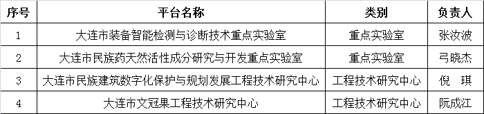 本次获批的4个科研平台,包括张汝波教授负责的“大连市装备智能检测与诊断技术重点实验室”、弓晓杰教授负责的“大连市民族药天然活性成分研究与开发重点实验室”、倪琪教授负责的“大连市民族建筑数字化保护与规划发展工程技术研究中心”、阮成江教授负责的“大连市文冠果工程技术研究中心”。上述重点实验室和工程技术研究中心的组建基于生物工程、电子信息学科研究方向或学校重点培育学科,在科学汇聚整合科研资源的基础上,充分凝练学科方向,部分平台填补了国家民委、辽宁省和大连市研究空白。评审专家在进校考察过程中,对学校的投入力度及上述平台的研究团队、科研条件、科技成果、服务能力等均给予充分肯定。