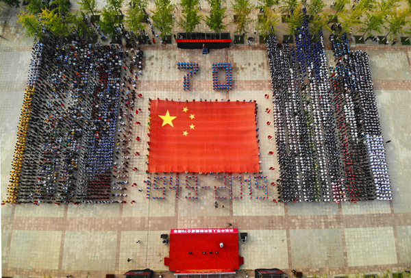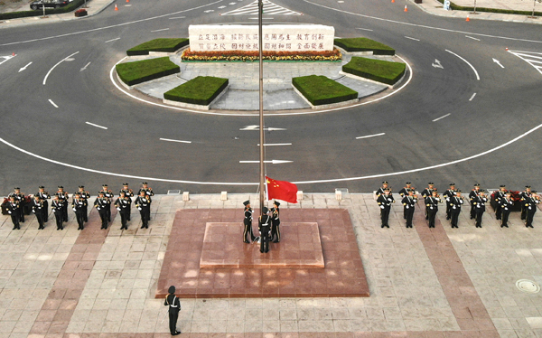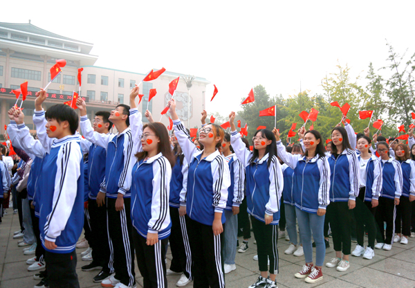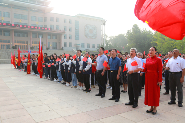 在庄严的国歌声中,五星红旗冉冉升起,全体师生面向国旗高唱国歌,行注目礼,心潮澎湃、豪情满怀。
