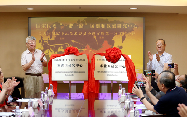会议举行国家民委“一带一路”国别和区域研究中心揭牌仪式。国家民委教育科技司副巡视员王宏晓、中国社会科学院学部委员郝时远研究员共同为“蒙古国研究中心”和“东北亚研究中心”揭牌。