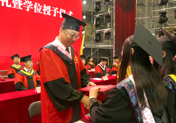 在学位授予仪式上,校领导及学位评定委员会委员为所有毕业生扶正流苏,授予学位并合影留念。