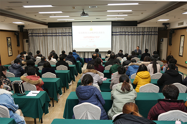 刘玉彬从充分认识全国教育大会的重大意义,深刻理解全国教育大会精神,准确把握高等教育发展面临的形势与任务,贯彻落实学校党代会报告确定的各项任务等四个方面,结合学习习近平总书记在辽宁考察时和在深入推进东北振兴座谈会上的重要讲话精神、习近平总书记致西藏民族大学建校60周年贺信精神以及全省教育系统开展“解放思想推动高质量发展大讨论”等有关精神,进行了细致的宣讲。