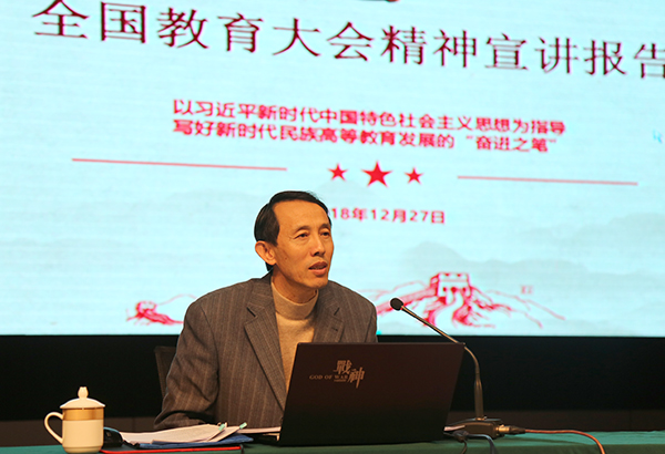 民大新闻网讯 为深入贯彻落实全国教育大会精神,按照学校党委统一部署安排,12月27至28日,校长刘玉彬为信息与通信工程学院、物理与材料工程学院师生以及发展规划与学科建设处全体教职工,作了题为《以习近平新时代中国特色社会主义思想为指导,写好新时代民族高等教育发展的“奋进之笔”》主题宣讲报告。