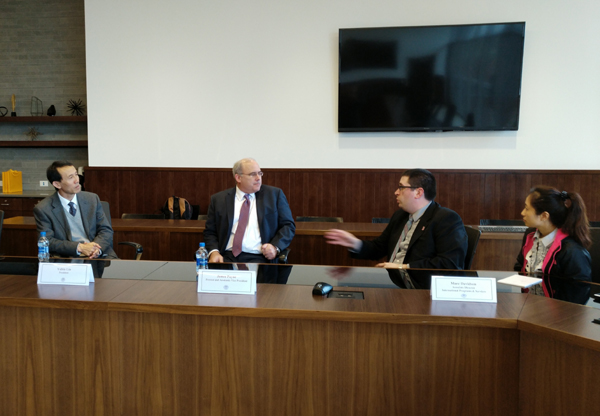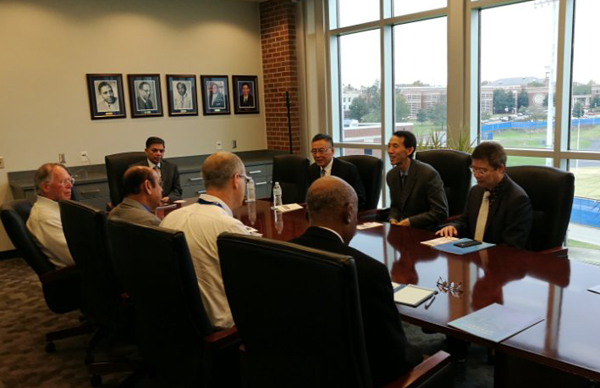 在田纳西州立大学,代表团与该校校长Dr. Mark G. Hardy、常务副校长Dr. AlisaL. Mosley、农学以及部分学院负责人围绕两校师生交流、科研合作等方面进行了讨论。代表团还参观了该校学生学习及生活场所,并分别与该校国际处、土木建筑工程学院、计算机科学学院负责人就进一步开展合作进行了交流。
