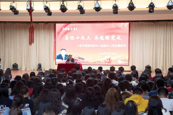 经济管理学院举办了2017级新生入党启蒙教育,学院党总支书记张树安从学习领会十九大报告的精神和内涵出发与同学进行了分享。十九大是我们党不忘初心、牢记使命、高举旗帜的一次盛会,习近平同志所作的报告,从党和国家事业发展全局高度和长远角度,回答了新时代坚持和发展中国特色社会主义的一系列重大理论问题和实践问题,阐明了未来一个时期党和国家工作的大政方针和战略部署。张树安通过数据对比、生动事例,就报告中的新判断、新提法、新概念、新要求、新部署以及民生问题、教育问题、管党治党等内容进行了讲解。
