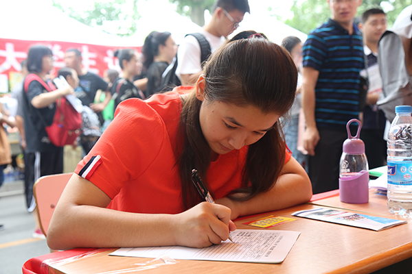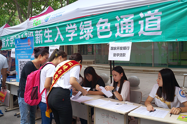 在学校的绿色通道处,老师们正忙着整理一位新疆学生的材料,帮她办理助学贷款。这位来自新疆博州的姑娘叫古丽娅尔•库尔班,带着全村人为她筹集的学费,独自一人坐了四天的火车终于到达了学校。“学校在我入学前就给我申请了临时补助,解决了车票钱,并且为我购买了全新的被褥。坐着校车回到学校后,学院老师早早就在等着了,帮我办贷款、领着我报名,真的很感谢老师和同学们对我的帮助。”古丽娅尔说。学院老师当场表示,会为古丽娅尔提供勤工助学的岗位,还会帮助她申请国家助学金,尽一切能力为她提供帮助,不让一名同学因为家庭贫困而无法享受美好的大学时光。