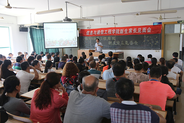 下午两点,开发区二教212阶梯教室里座无虚席,信息与通信工程学院新生家长见面会正在这里举行。学院院长张俊星亲自担任讲解员,把专业介绍作为见面会的讲授重点。新生报到第一天,各学院抓住与学生家长难得的见面机会,纷纷举行新生家长见面会,为使家长们对学院有更为全面的认识与了解,很多学院建立了包括院领导班子、系主任、班导师、辅导员在内的“讲师团”和“答疑小组”,就学院专业建设、师资队伍以及人才培养等情况,进行详细讲解和现场回答。在现场交流环节,各学院领导和老师认真聆听每一位家长的提问,耐心细致讲解每一个问题,并送去真诚的祝福,让学生家长第一时间感受到了学校的温暖。