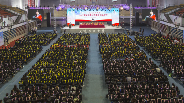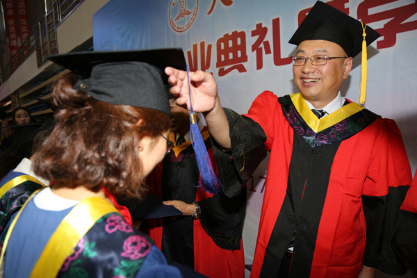 在隆重热烈的气氛中,校领导及学位评定委员会委员为毕业生拨流苏,颁发学位证书,并合影留念。