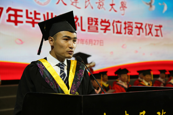 毕业生代表、生命科学学院食品质量与安全专业木热地力·阿布都赛米拉提同学回顾了大学生活的点点滴滴,感谢母校的教育培养,感谢老师的辛勤付出,2017届毕业生将承载着母校的殷切期望和深情嘱托,胸怀大志,脚踏实地,勇于创新,敢挑重担,为祖国的发展和家乡的建设贡献力量。