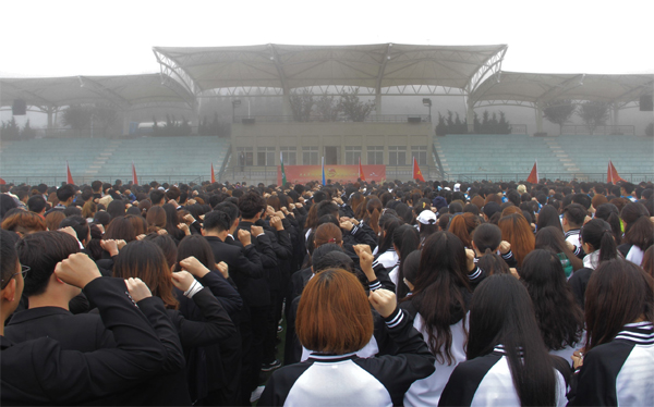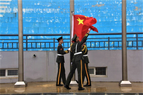 7时整,伴着雄壮有力的国歌,五星红旗冉冉升起,全场师生面向国旗行注目礼。