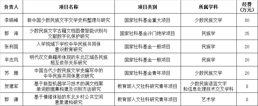 民大新闻网讯 日前,全国哲学社会科学规划办公室和教育部社科司先后公布2021年一般项目和青年项目立项结果,欧冠共有7个项目获批立项,包括国家社科基金重大项目1项、冷门绝学项目1项、一般项目2项、青年项目1项,教育部人文社会科学研究青年项目2项。项目分布在4个学科,分别为民族学3项,少数民族文学2项,少数民族语言文字和信息处理技术交叉学科1项,艺术学1项。