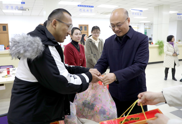“有你们,校园才有活力。”在学生处大厅,赵铸与留校学生热情座谈交流,详细了解留校学生的学习和生活保障情况,并与大家互留微信,勉励他们珍惜假期时间,充实提升自己、全面发展,同时要做好个人防护,并将新春大礼包送到每一名学生手中。