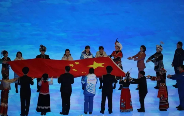 ▲2022年北京冬奥会开幕式,中央民族大学56个民族代表参与传递国旗。中央民族大学党委宣传部供图