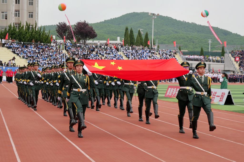 入场式完毕,全场起立,高唱中华人民共和国国歌。在雄壮的国歌声中,鲜艳的五星红旗冉冉升起,迎风飘扬。接着举行了校旗升旗仪式。