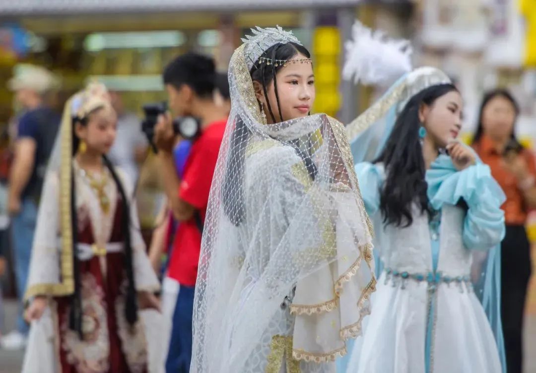 ▲2024年8月12日,新疆乌鲁木齐市大巴扎步行街,游客穿着经过改进的民族服饰拍摄写真照片。8月正值新疆旅游旺季,各种民族特色旅拍主题受到游客的追捧。中新社记者 刘新/摄
