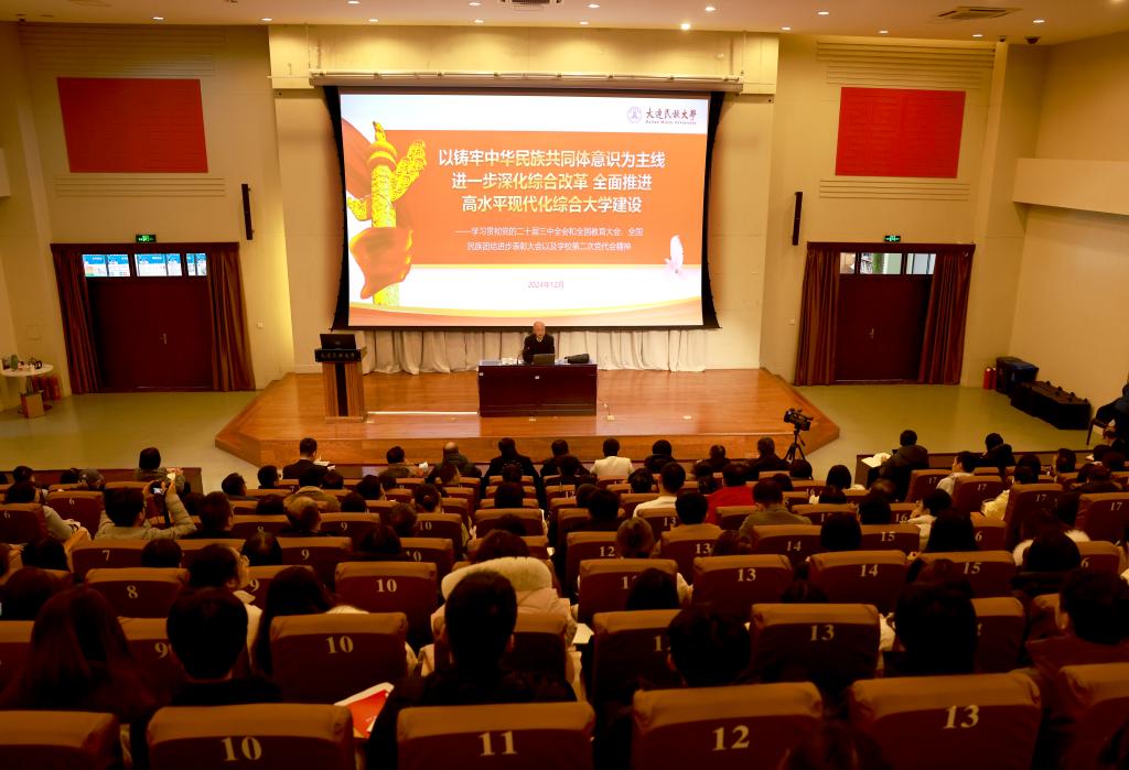 民大新闻网讯 为深入学习贯彻党的二十届三中全会和全国教育大会、全国民族团结进步表彰大会精神,落实全省和全市教育大会精神,进一步贯彻落实学校第二次党代会精神,学校党委组织开展主题宣讲活动。12月10日,党委书记赵铸在金石滩校区弘德楼报告厅作了首场宣讲报告,机电工程学院和理学院、预科教育学院师生,金石滩校区常驻部门干部职工参加报告会。
