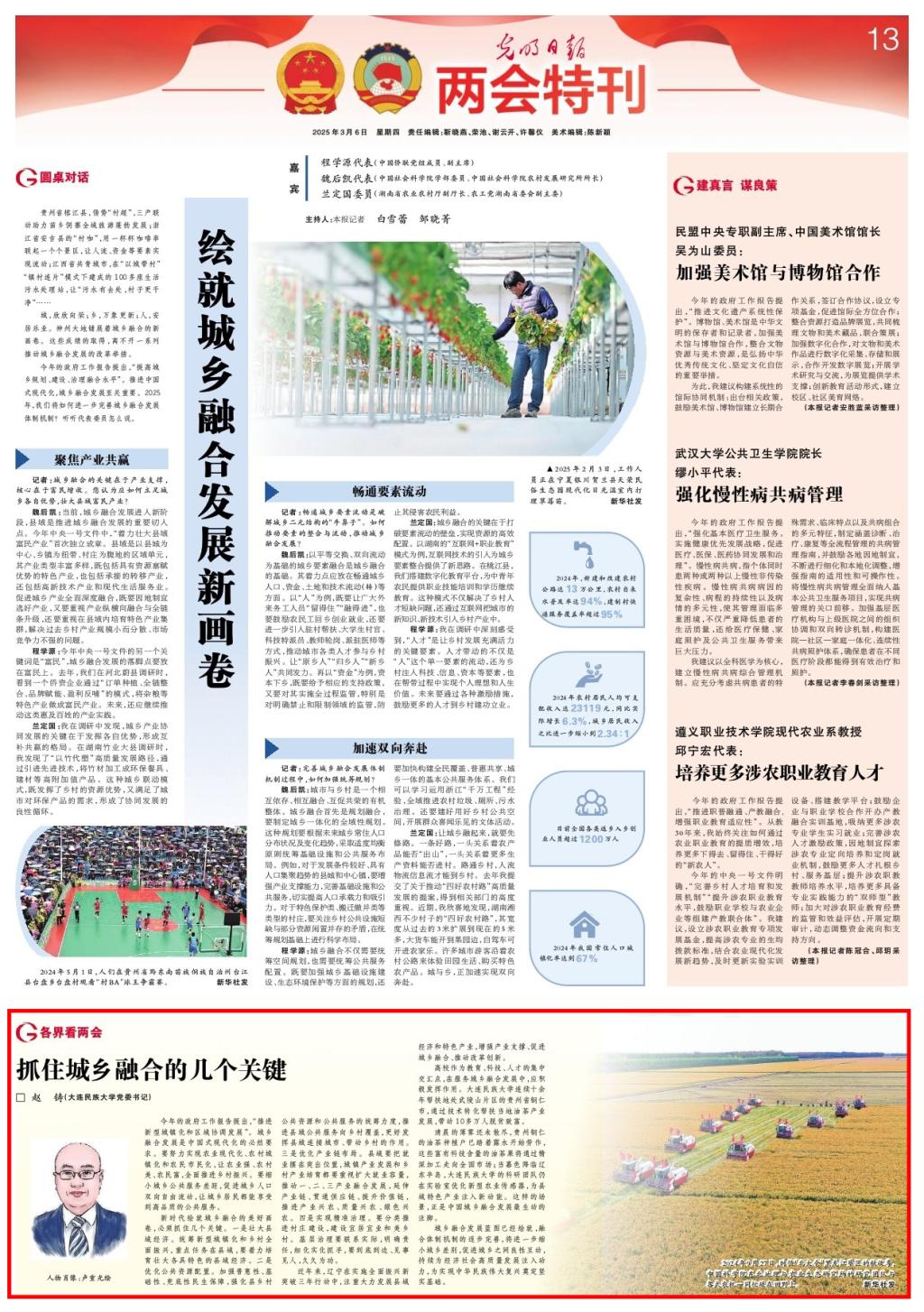 民大新闻网讯  在2025年全国两会胜利召开之际,3月6日,《光明日报》“两会特刊”专题专刊,刊发党委书记赵铸署名文章:抓住城乡融合的几个关键。