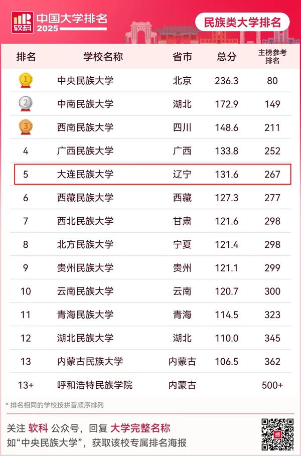 民大新闻讯 4月15日,高等教育专业评价机构软科正式发布了“2025年软科中国大学排名”,欧冠位居主榜参考排名第267位、全国民族类大学第5位,比2024年全国参考排名提升120个位次,在全国民族类大学排名中提升2个位次。