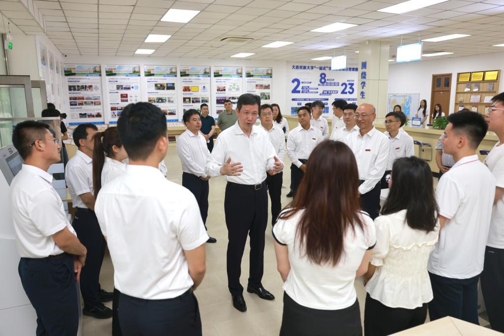 靳国卫听取了学校办学情况介绍,实地考察了生物技术与资源利用教育部重点实验室、物理与材料工程学院,观摩了设计学院教育教学成果展,走访了“一站式”学生社区,并以四不两直方式检查学生食堂及公寓安全管理工作,并与师生深入交流,详细了解学校建设发展历程、铸牢中华民族共同体意识教育、科技创新进展、大学生思想政治工作、校园安全管理等情况,对学校近年来办学成果给予肯定。