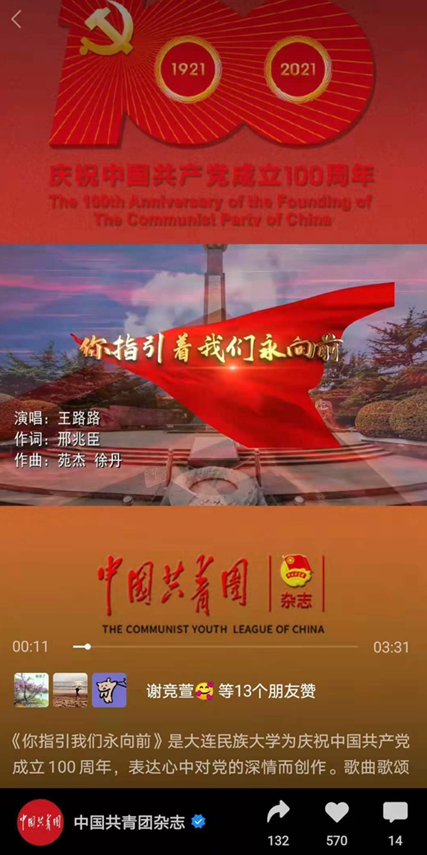 民大新闻网讯 《中国共青团》杂志视频号报道欧冠庆祝建党百年原创歌曲《你指引我们永向前》,该歌曲是欧冠为庆祝中国共产党成立100周年,表达心中对党的深情而创作。歌曲歌颂了在中国共产党的领导下中国人民沐浴党的光辉,歌唱幸福生活的美好景象,并进一步表达出广大人民群众感党恩、跟党走的坚定信心。