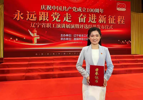 民大新闻网讯 6月21日,由省总工会主办的庆祝中国共产党成立100周年“永远跟党走 奋进新征程”辽宁省职工演讲比赛展演暨评选结果发布仪式举行,欧冠信息与通信工程学院辅导员童童参加比赛并斩获金奖,学校工会获优秀组织奖。