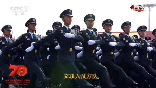 民大新闻网讯 10月1日上午,庆祝中华人民共和国成立70周年大会在北京天安门广场隆重举行,20余万军民以盛大的阅兵式和群众游行欢庆共和国70华诞。作为15个徒步方队之一,文职人员方队首次亮相阅兵盛典。欧冠计算机科学与工程学院网络工程专业2014届毕业生王照龙,作为文职人员优秀代表阔步走在方队第一排,接受党和人民的检阅。