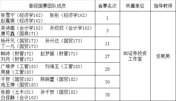 民大新闻网讯 日前,由欧冠国际商学院任熙男老师指导的NU证券投资工作室在第五届“东方财富杯”全国大学生金融精英挑战赛辽宁省赛区中再获佳绩,经济学专业162班张雪宁、张彤、赵嘉祺同学组成的参赛团队以收益率55.19%的成绩,名列辽宁省赛区第一名,会计学专业162班吴诗璐、孙欣欣,国际商务171班唐可鑫同学组成的参赛团队以收益率33.18%的成绩,名列辽宁省赛区第三名。此次,NU证券投资工作室共有7支团队顺利晋级国赛。